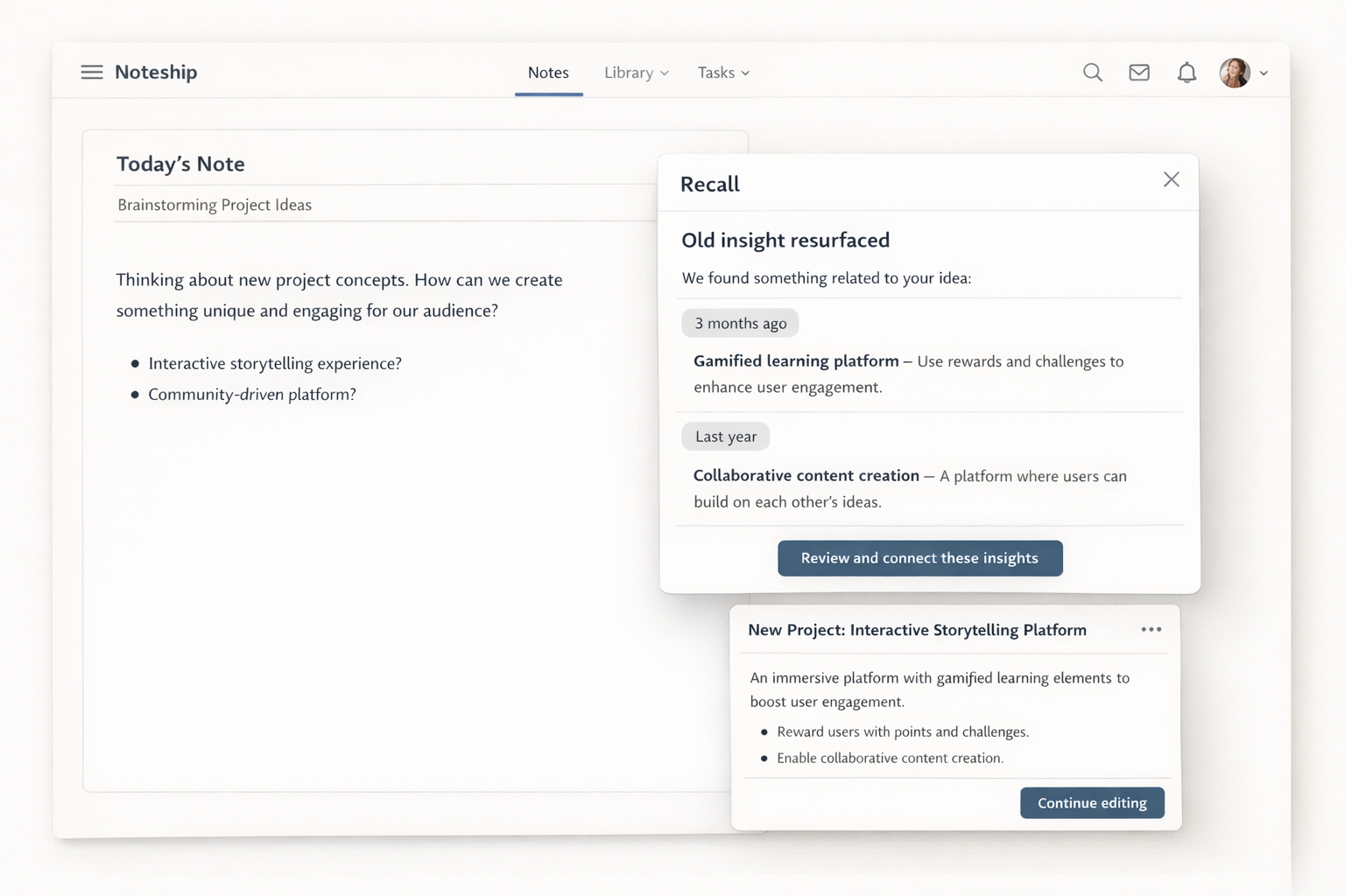 Noteship turns your notes into LinkedIn and Medium drafts with meaning-based recall, calm editing, and simple scheduling.